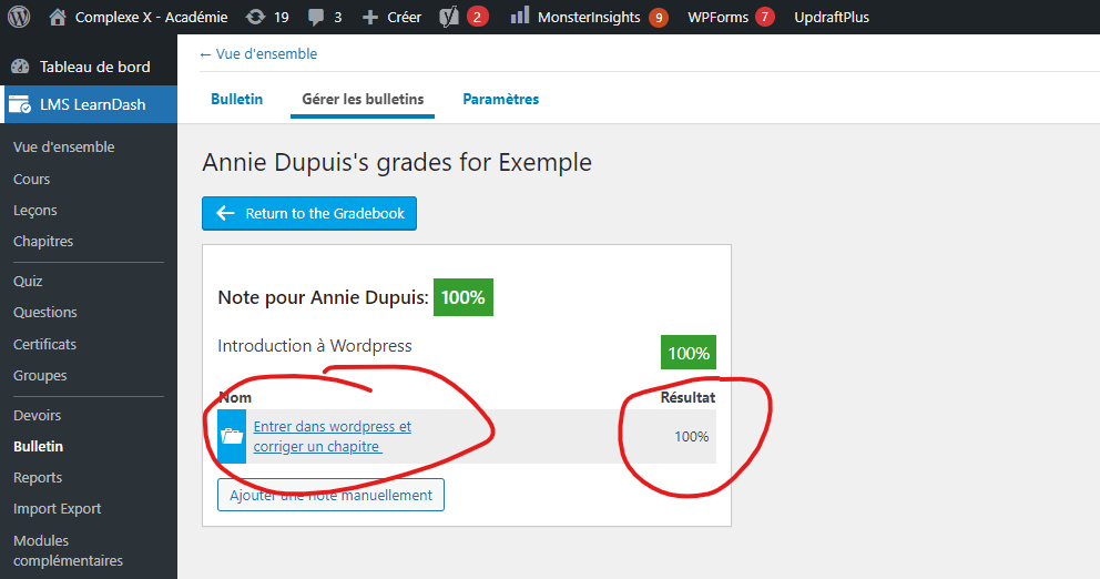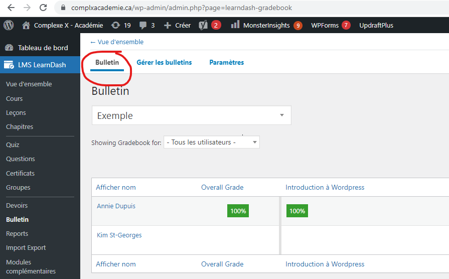 Aller sur LMS LearnDash et cliquer sur Bulletin.